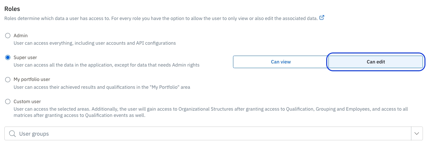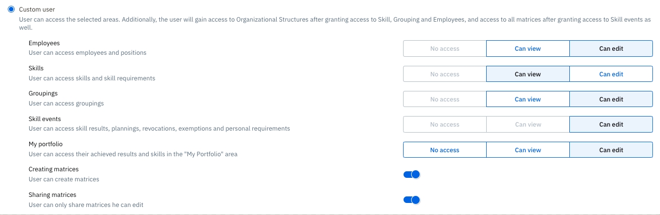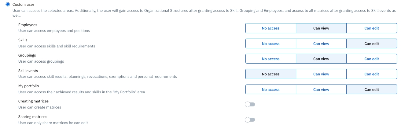 Now the user will have access to shared matrices, the alert list and all employees & skills (also known as qualifications) contained in the matrix.