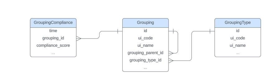 GroupingCompliance (Event) and Grouping (Entity) relationship: