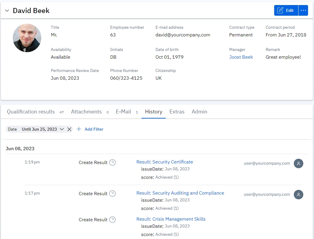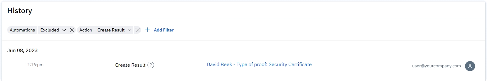The Overall History shows the time-stamped change that was made, along with the user who enacted the change. Hyperlinks will take you to the relevant page (e.g. clicking on David Beek - Type of proof: Security Certificate will take you to the David’s Security Certificate result details page).