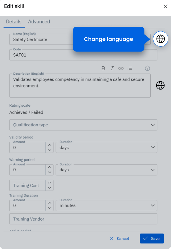After the localization feature is enabled, you will see a new icon next to all translatable fields when editing skills, groupings and rating scales.