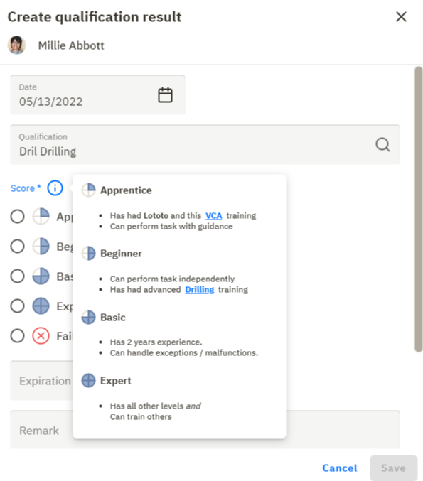 To make sure every user has the same understanding of what it exactly means to have achieved qualification on a certain level, you can now give each level a description. These level descriptions can be made visible while adding qualification results, to help users understand the differences between them, and select the right one.