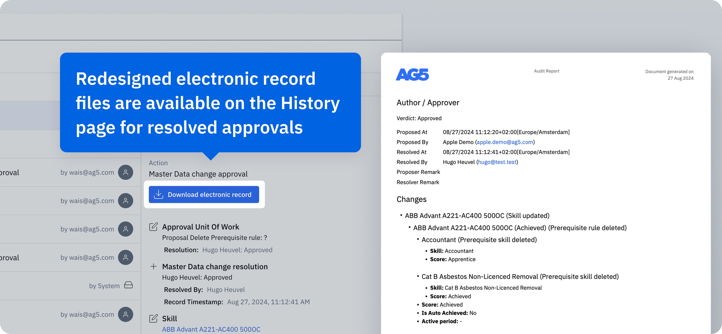 We’ve redesigned electronic record files for resolved approvals. They are available for download from the History page, and now include a new look and additional details. This should enhance the records’ clarity and utility, allowing for better tracking and auditing of approval processes.