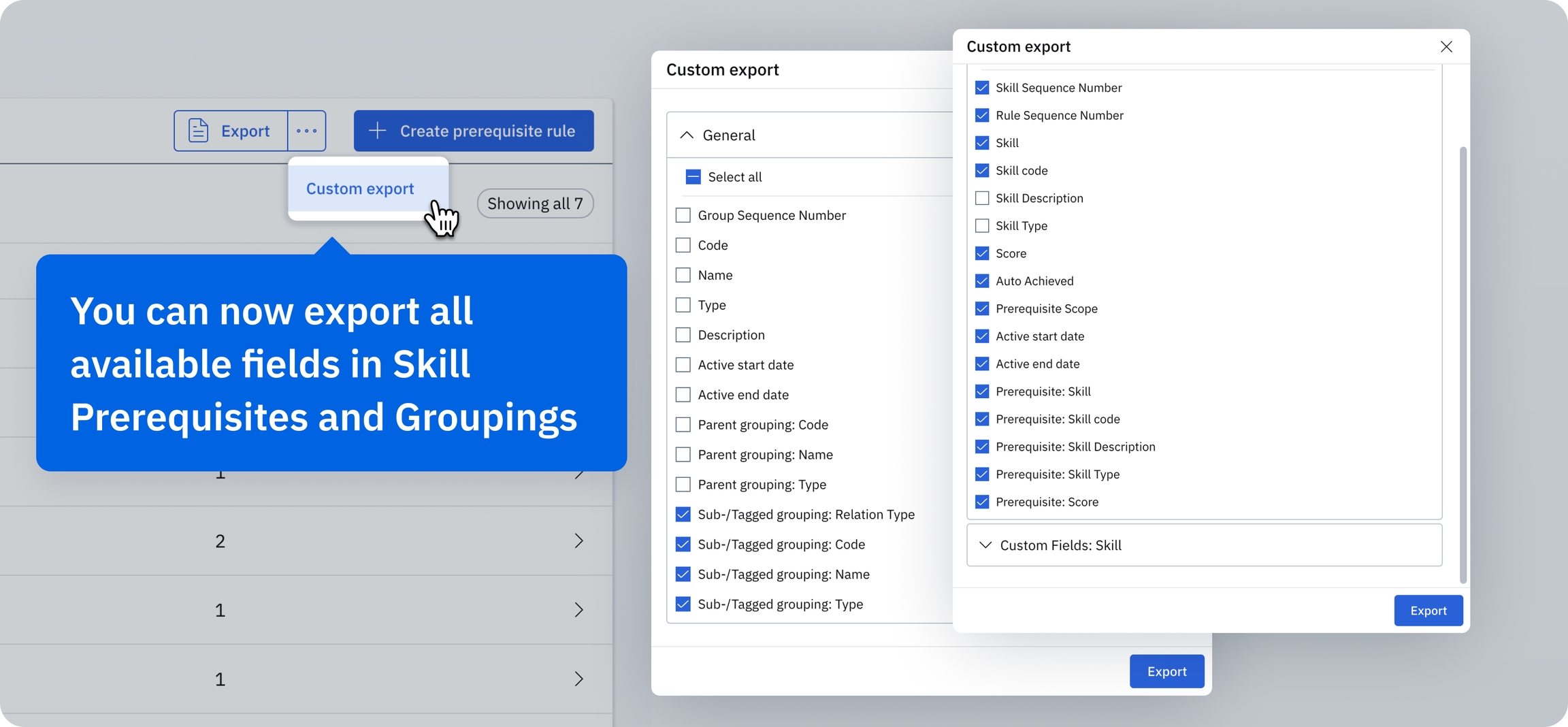 You can now export all available fields in Prerequisites and Groupings, including subgroupings, prerequisites, and related fields. This allows for more comprehensive and detailed data exports, so you can capture the full scope of your configurations and dependencies – and better manage and analyze your data externally.