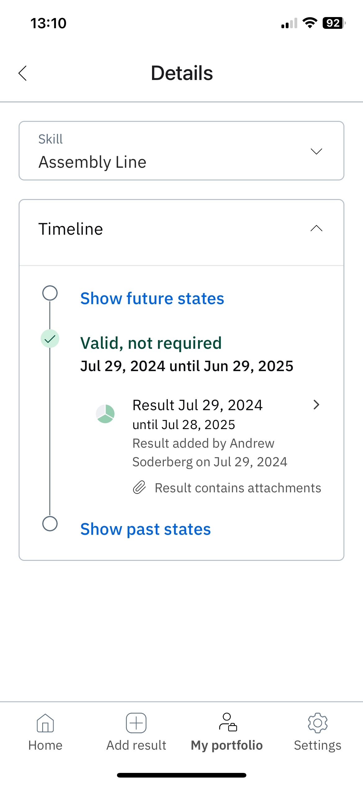 This tab allows users who have an employee profile to all of their valid and required skills. Tapping on each skill provides details, as above.