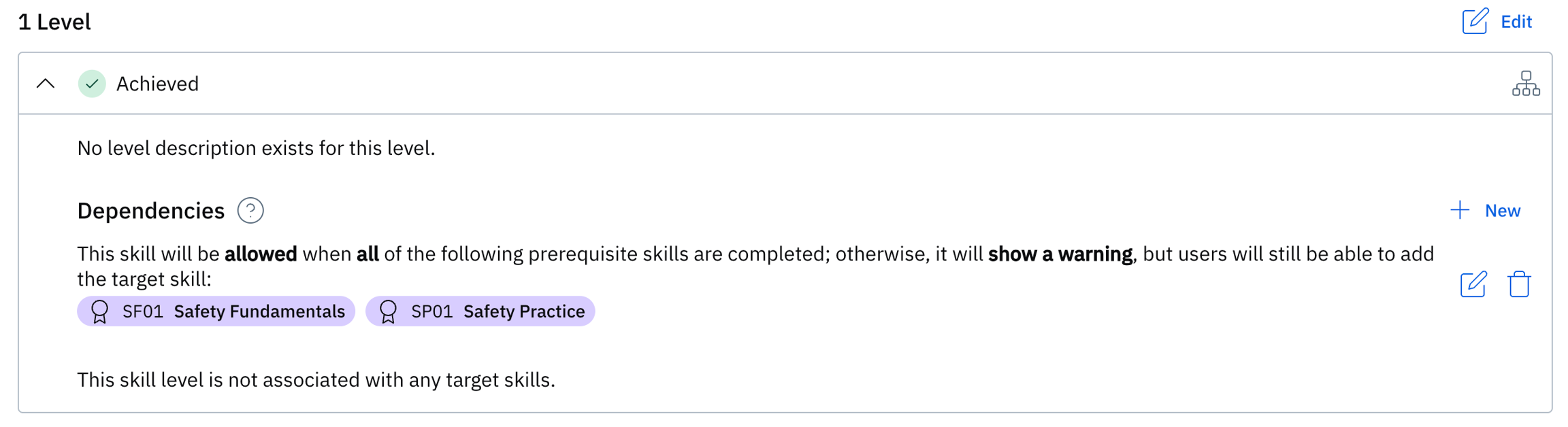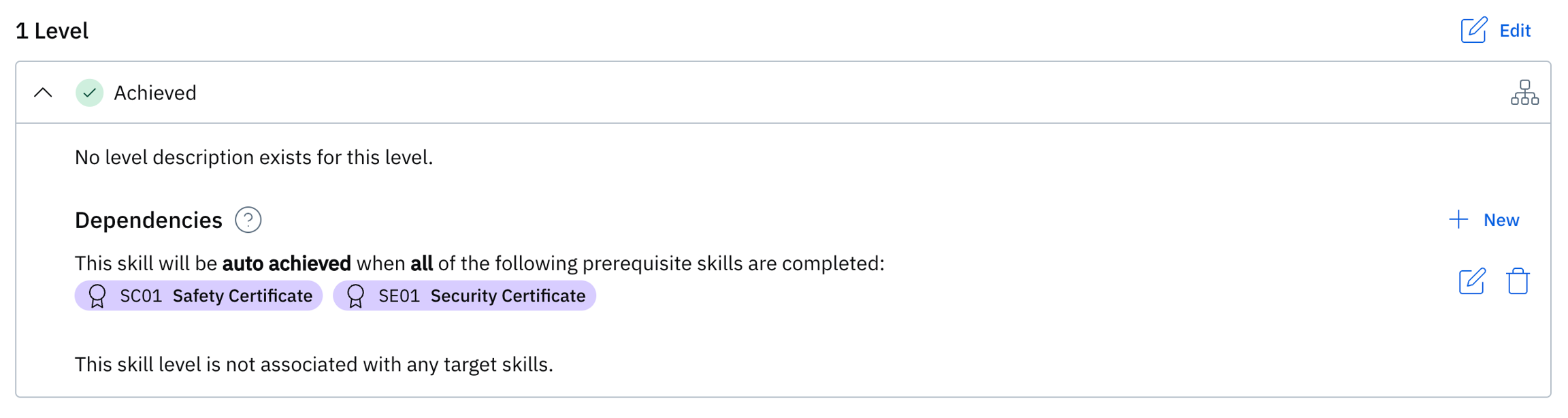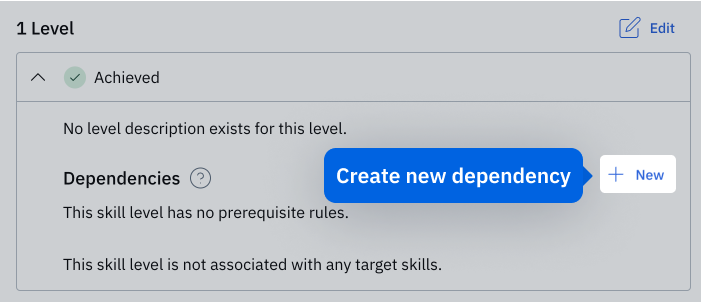 To add prerequisite rules, open the skill to which the rule should apply. Within the rating scale, you can set rules for each level of that skill by clicking on the '+ New' button on the right-hand side of the screen.