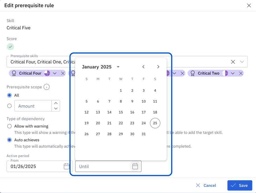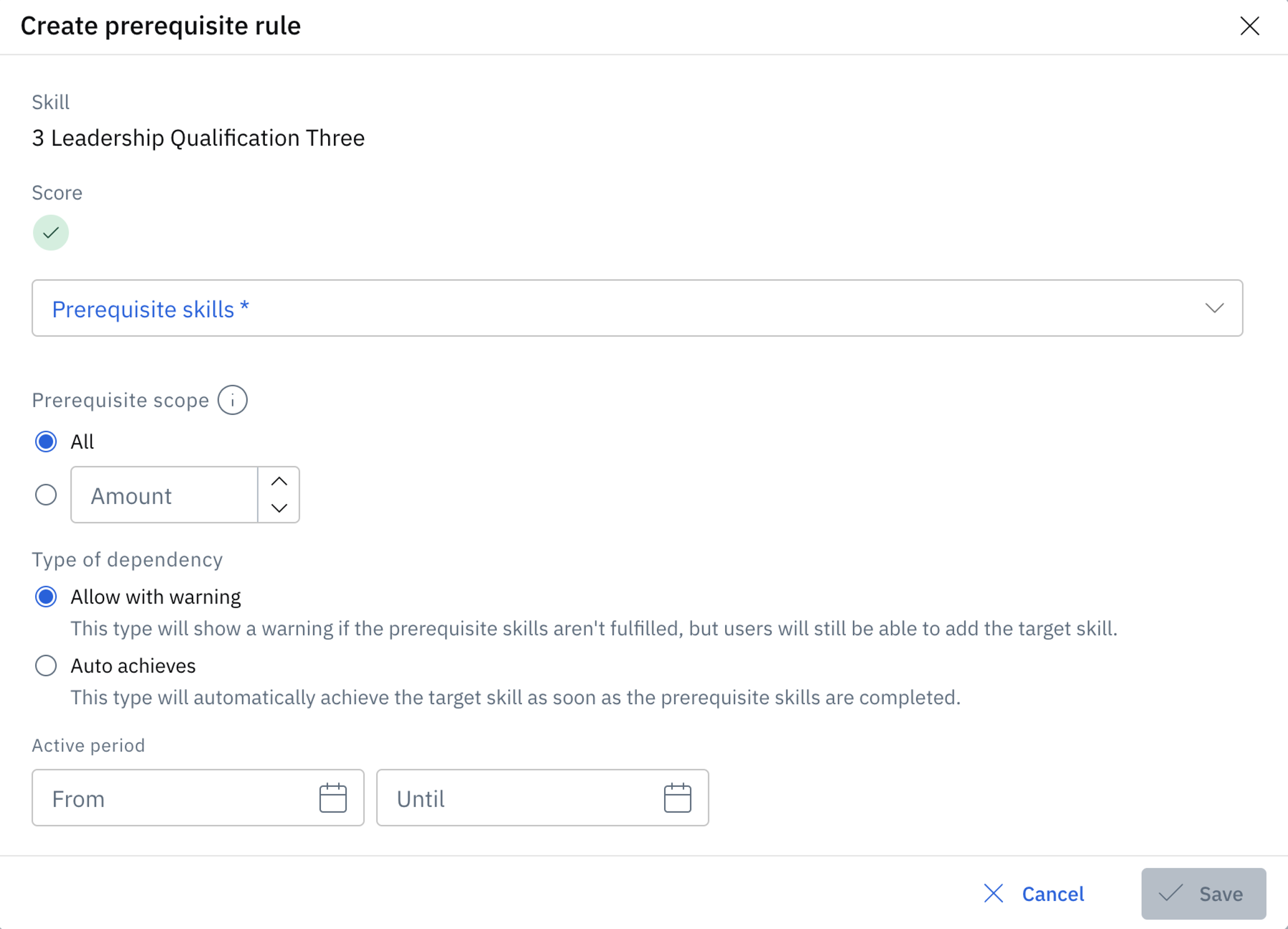 After that, select the scope of the prerequisite, which means should employees have to achieve all prerequisite skills, or is achieving (X / Total skills) sufficient?