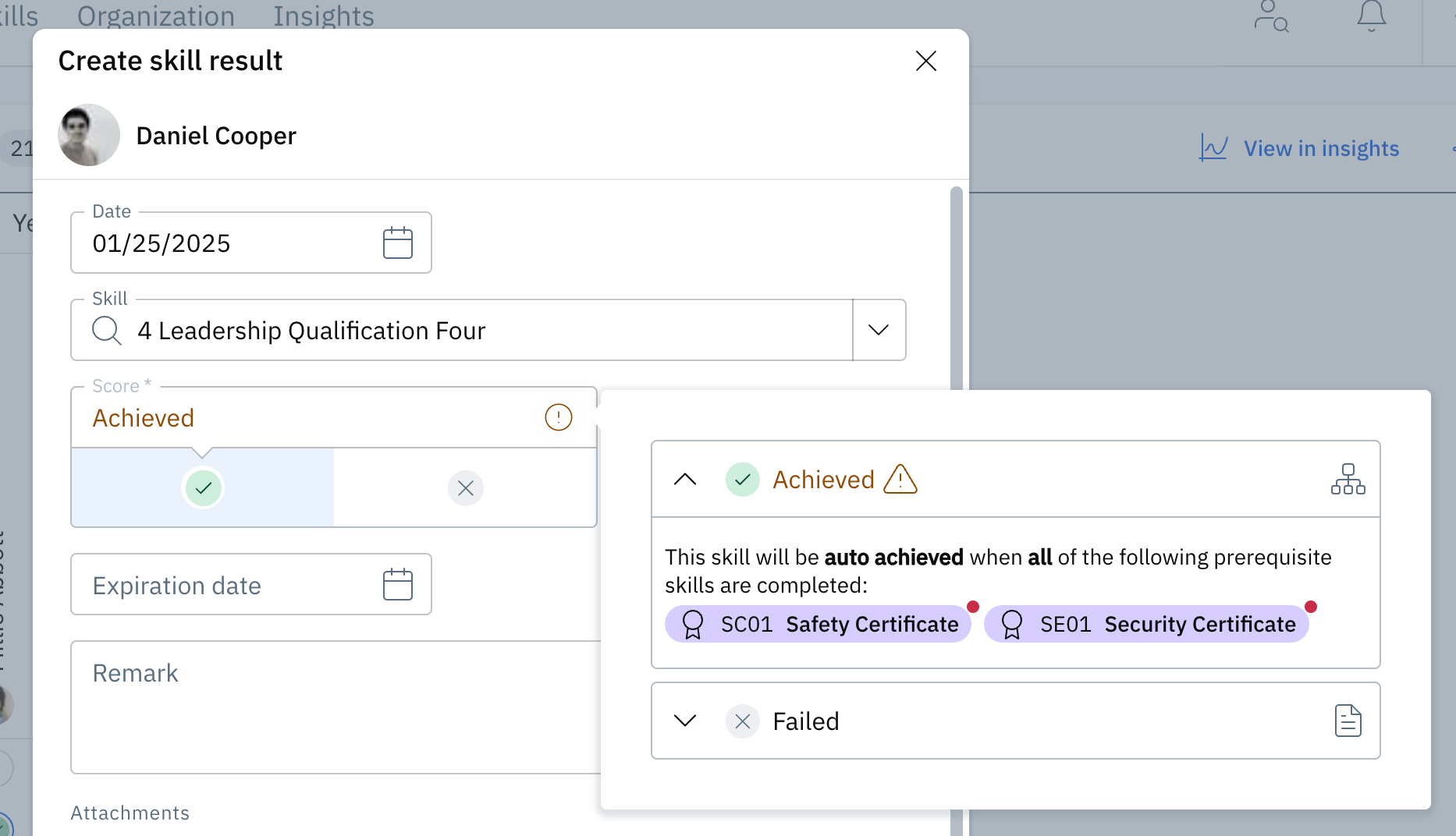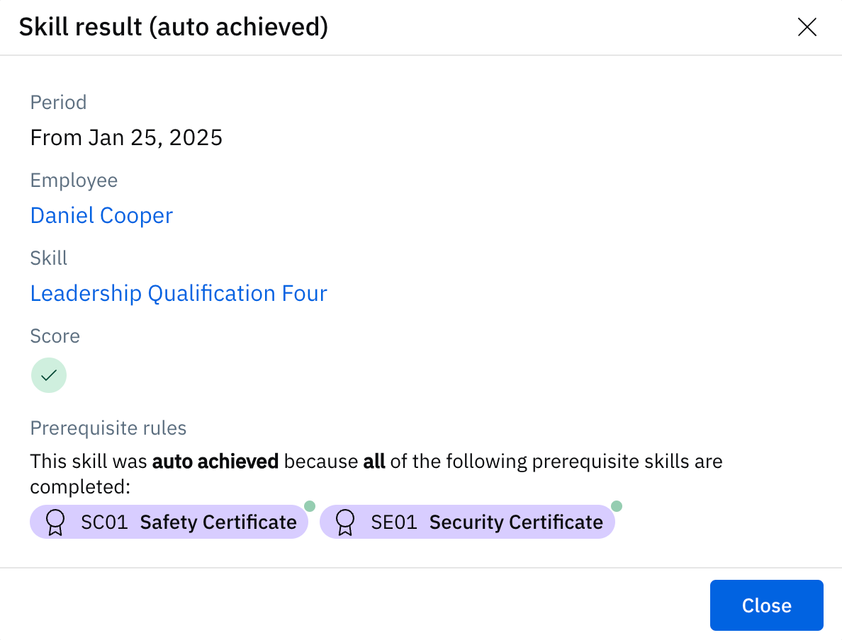 A prerequisite can be achieved automatically as soon as connected skills are achieved - or it can be manually achieved by adding a result. Prerequisite rules can be very specific, as you can indicate the exact level that must be achieved for each skill.